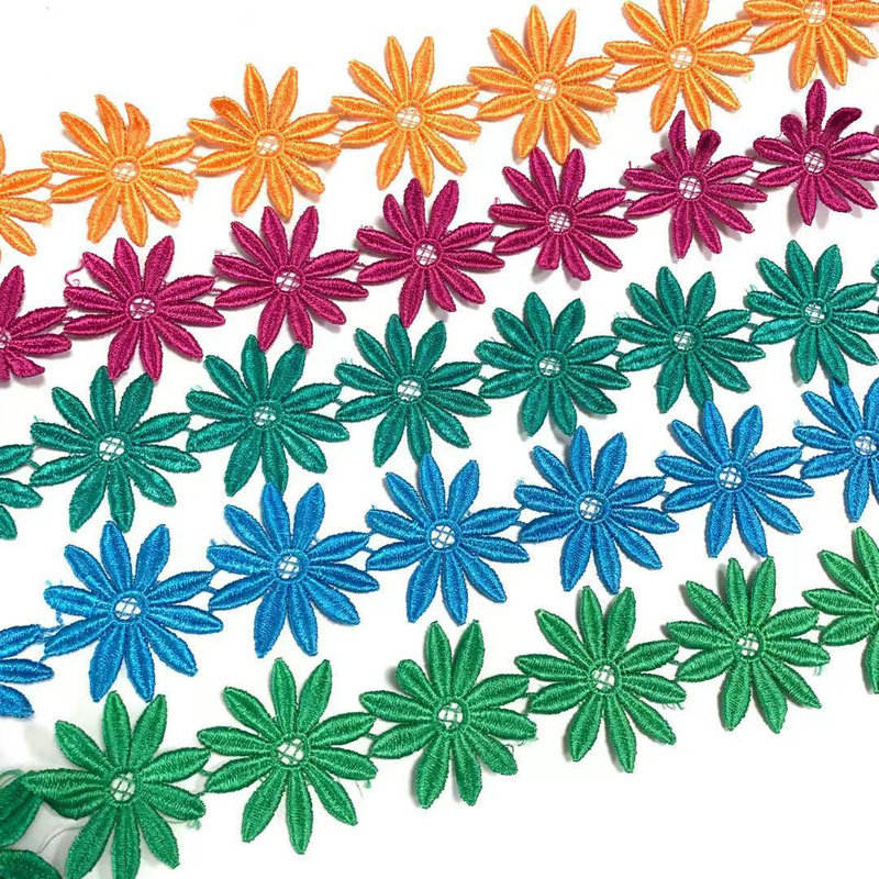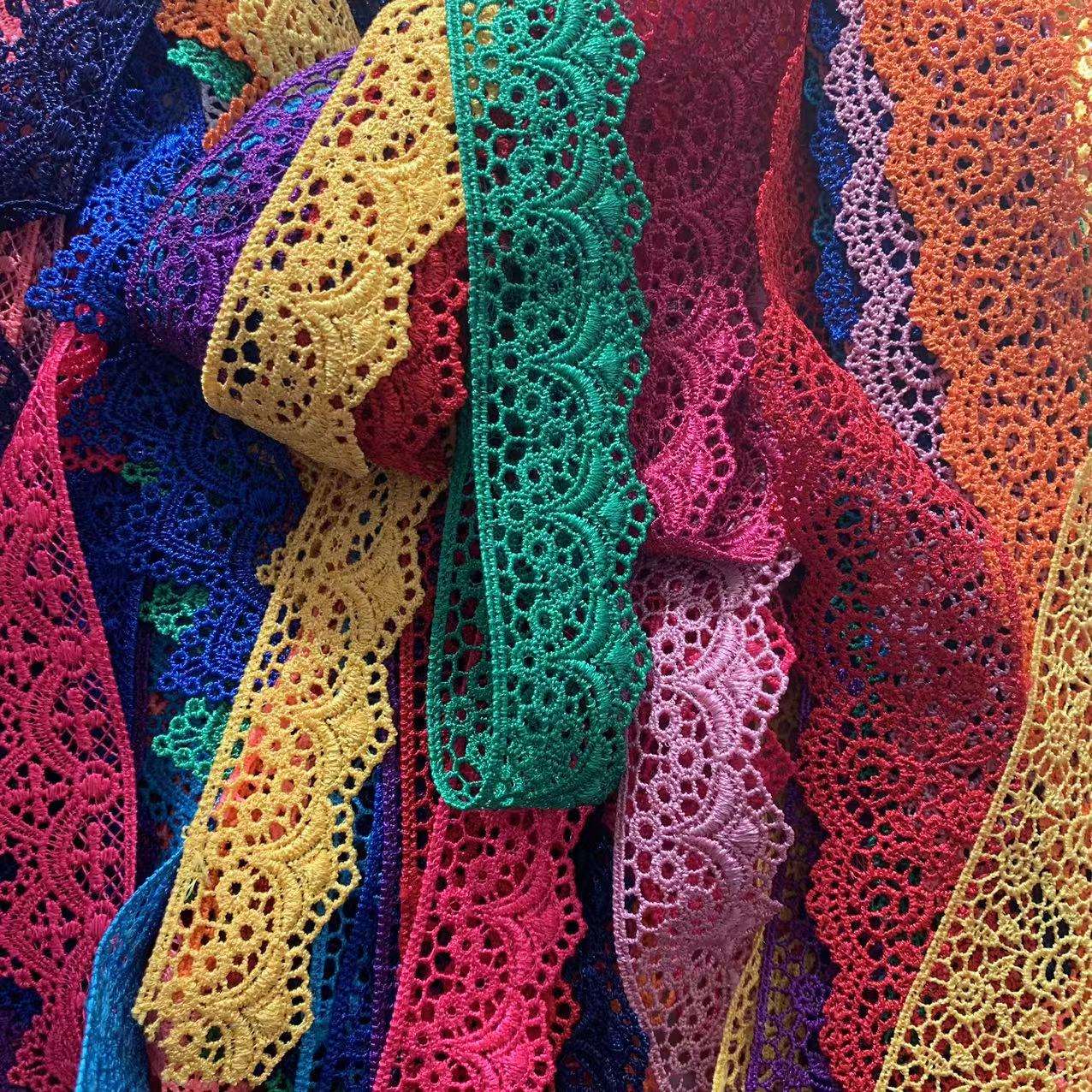 Vlastní polyesterová krajka úzká výšivka Krajka Trim Multi color vyrobená z vysoce kvalitního polyesterového materiálu, s jemným vyšívacím řemeslným zpracováním, má bohaté barvy a nastavitelnou šířku. Je vhodný pro dekoraci dámského oděvu, dětského oblečení a domácích předmětů